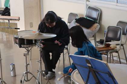 楽器ごとに分かれての練習です。基礎をしっかりと学んでいきます。先輩が後輩に丁寧に教えている姿が印象的でした。