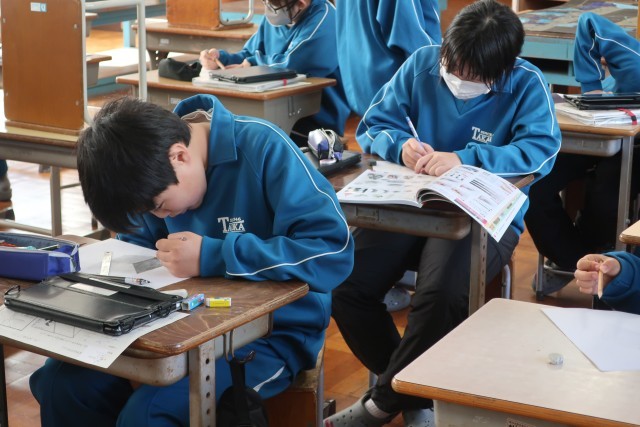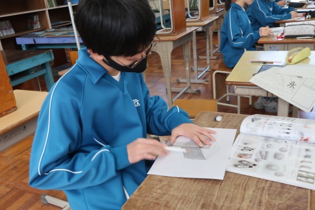 直方体のデッサンの学習で、「形(比率)を意識しながら、光に合わせた正確な明暗をつけよう」をテーマに活動に取り組んでいました。