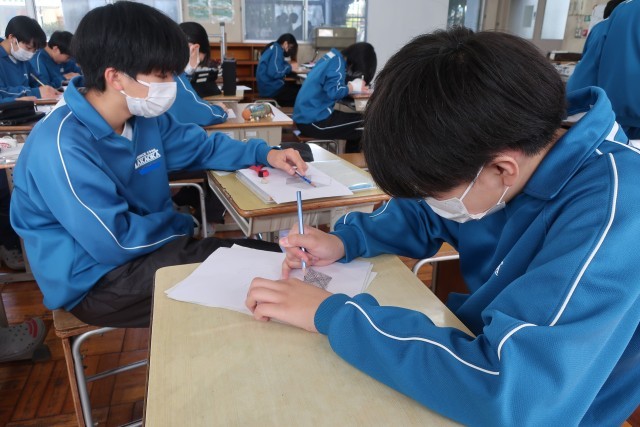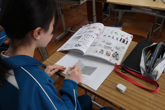 直方体のデッサンの学習で、「形(比率)を意識しながら、光に合わせた正確な明暗をつけよう」をテーマに活動に取り組んでいました。