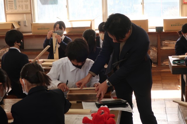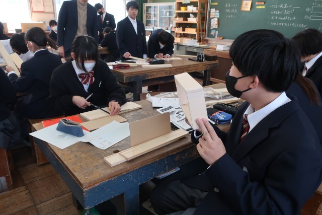 「tsunagaruプロジェクト」として、「人と人とがつながる『tsuna箱』を製作しよう」をテーマに木製品づくりに取り組んでいます。今回は、切断作業に向けた寸法を木材に記していました。