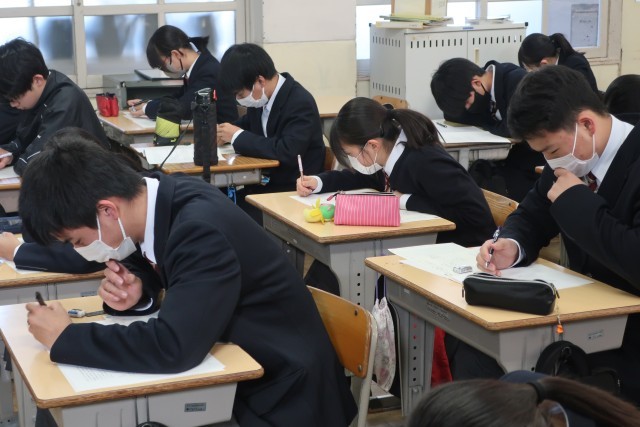 公立高校入試の予想問題に取り組んでいました。たくさんの問題を解き、いろいろなパターンに慣れていきます。当日慌てないよう、しっかりと取り組んでほしいと思います。