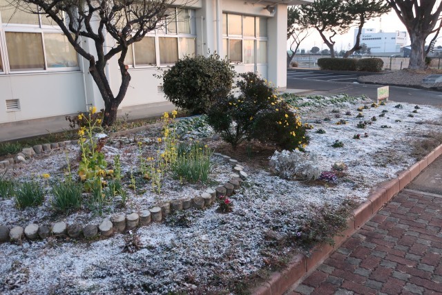 昨夜降った雪が、校内のいたる場所でかすかに残っています。地域によっては、同じ雪でも厄介者扱いされますが、このあたりではその影響もほとんどなく、癒しの光景となっています。