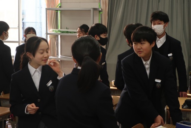 「どっちをえらぶ(二者択一)」に取り組みました。クラスによってお題もさまざまで、とても盛り上がっていました。ポイントは「笑顔で話を聴く」で、相手の話に興味を示しながら耳を傾けていました。