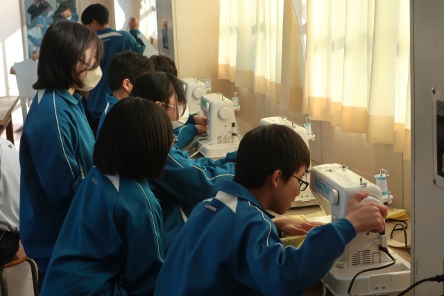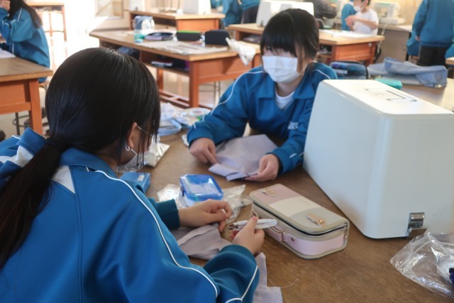 裁縫の学習で「エコバッグ」の製作に取り組んでいました。中学生になって初めての家庭科の実習。作業の手順を仲間としっかり確認しながら活動を進めています。ミシンの操作も手際よく進めています。仲間とお互いに見合うこと、近くの仲間に遠慮なくお願いできることで、活動がスムーズに行えているようです。