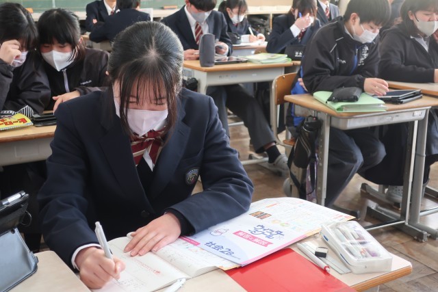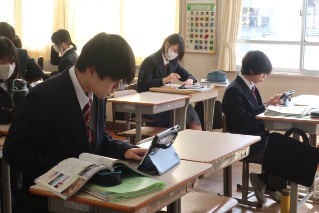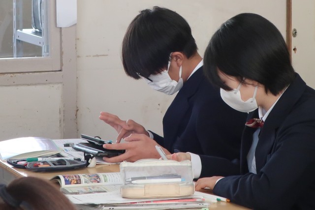 週末の家庭学習を経て、今日を迎えた社会の授業。翌日からの定期テストに備えて、個人で弱点を補強したり、仲間と問題を出し合ったりして学習を進めていました。