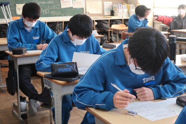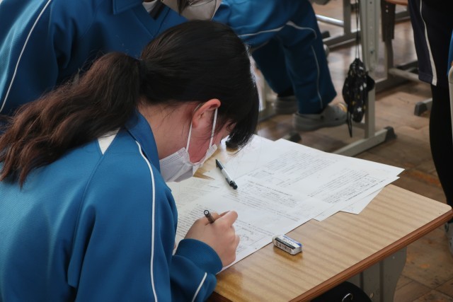先日実施した確認テストが返却され、解き直しに取り組んでいました。中学校での学習の締めくくりのため、正解できなかった原因をしっかりと確認していました。