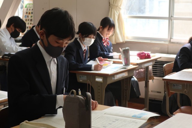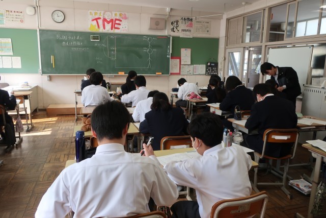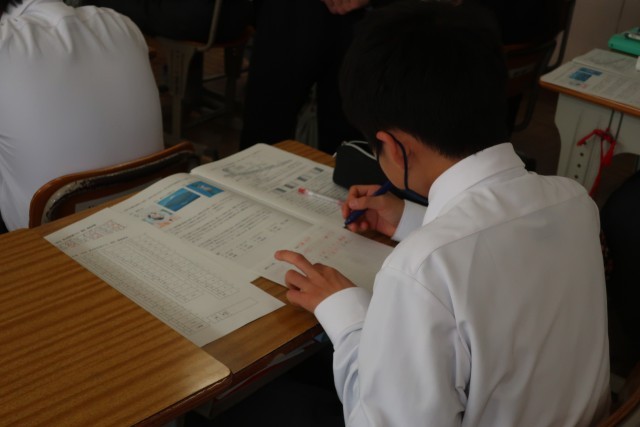 定期テストが返却され、解説が行われていました。その後、間違えた問題を中心に解き直しに取り組んでいました。