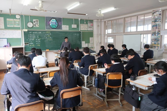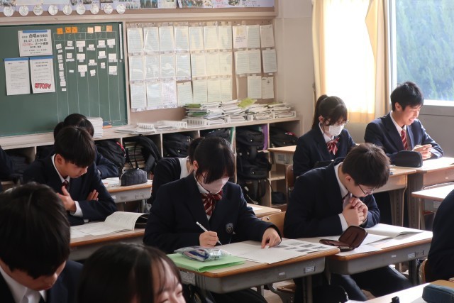 定期テストが返却され、解説が行われていました。正解にたどり着くまでの考え方を再度確認していました。