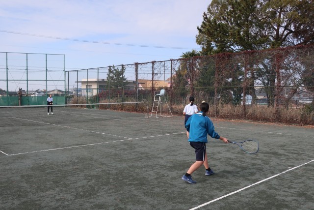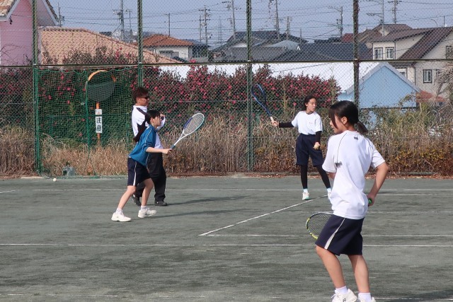 楽しみながら基礎体力トレーニングを行ってから、ラケットの面の向きを意識しながらの打ち合いです。テスト前までに身につけた技能を思い出しながらのメニューに取り組んでいました。