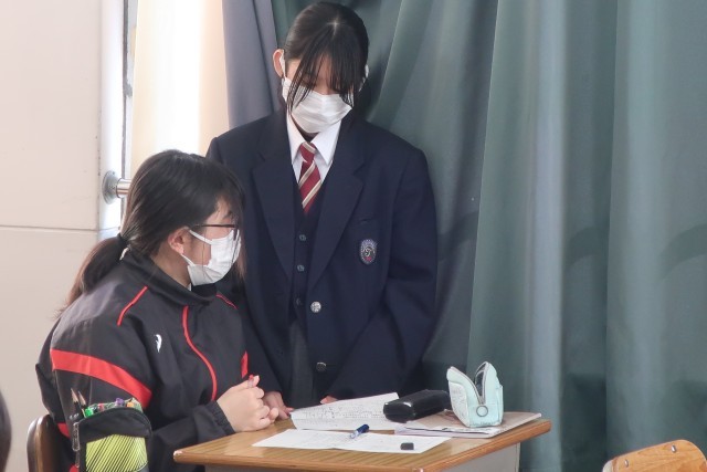 生徒が苦手とする計算問題の一つ「中和と沈殿量」。教科担任の熱の入った解説を聞いた後、お互いに説明できるようになるまで、何度も問題を解き直していました。
