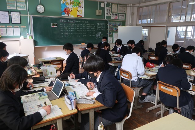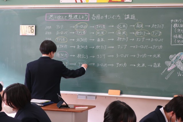 これまでに学習してきた6つの州のすごいところを思い出して整理し、「これから発展していきそうな州はどこだろう」をテーマに、グループで協力し、1年間の学習のまとめに取り組んでいました。