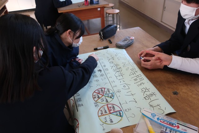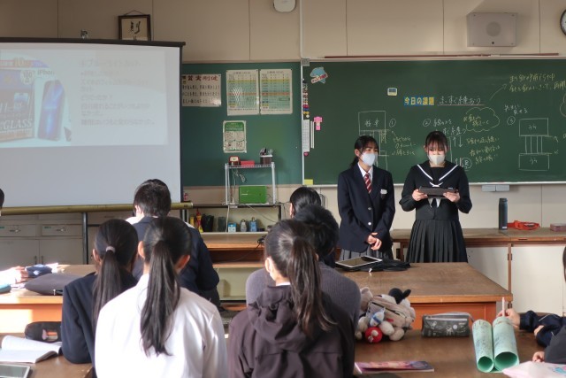 中学校生活の学習の集大成として、「生活に生かす意見発表」をテーマに、各グループで取り組んだ知って得する情報を発表していました。