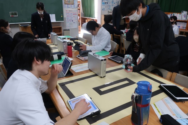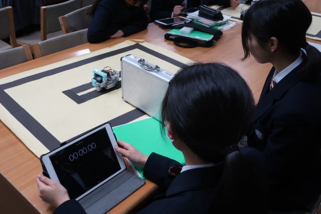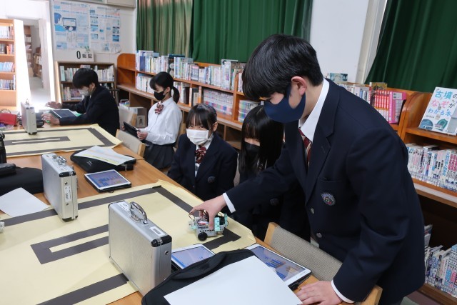 プログラミング学習で、「情報の制御・計測」について、実際にデータを並べ、プログラムどおりに動作が行われるか確認していました。