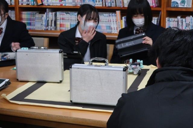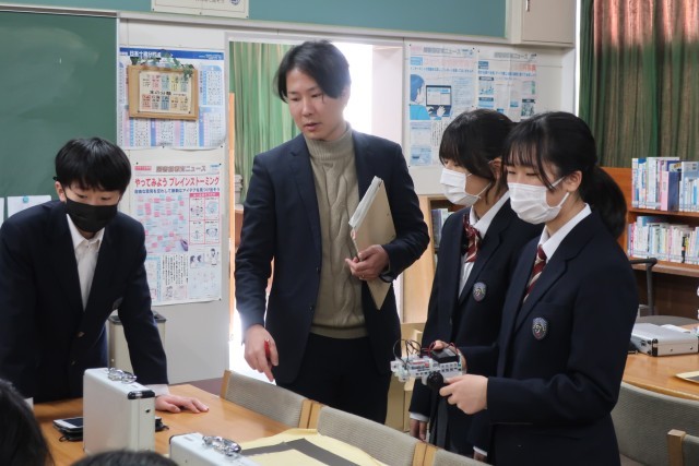 プログラミング学習で、「情報の制御・計測」について、実際にデータを並べ、プログラムどおりに動作が行われるか確認していました。イメージどおりの動きになった時の生徒の喜ぶ顔が印象的でした。