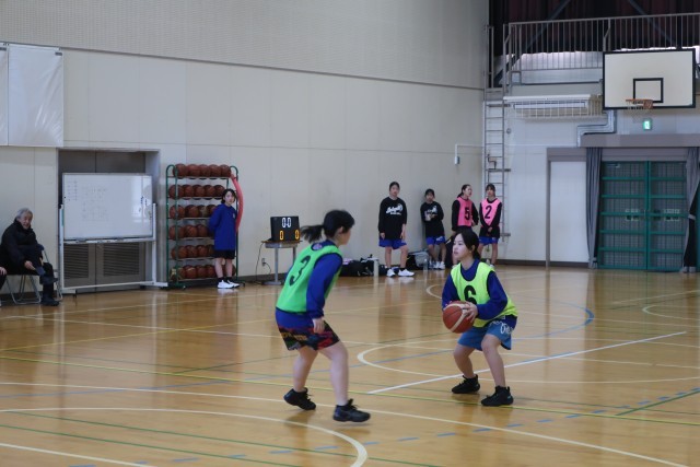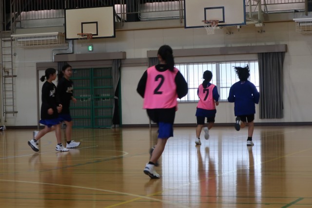 前林中との合同練習です。チームも学校別ではなく両校の混合で組んで活動しています。よいプレーが飛び出したり、がんばっている様子が見られると、お互いに称賛の声が上がり、とてもよい雰囲気で練習に励んでいました。