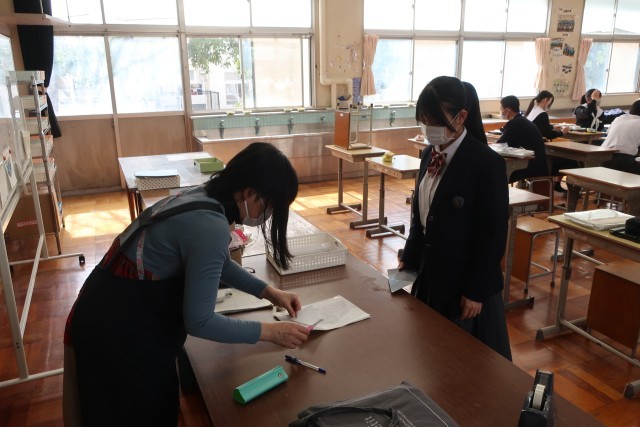 「ピラミッドシェード」というステンドグラスの作品づくりに取り組んでいました。義務教育最後の作品を完璧に仕上げようと、一生懸命活動している様子が印象的でした。