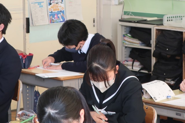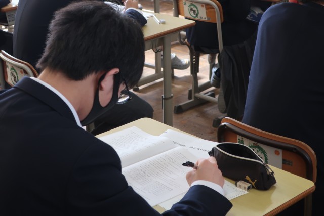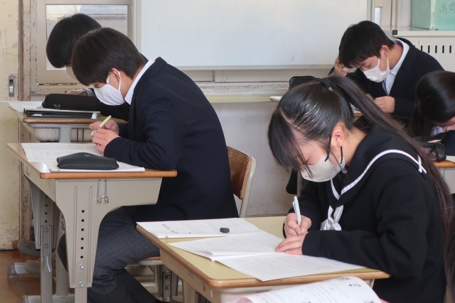 翌日に控えた公立高校一般入試に向け、対策プリントに取り組んでいました。本番では自信をもって臨んでほしいと思います。