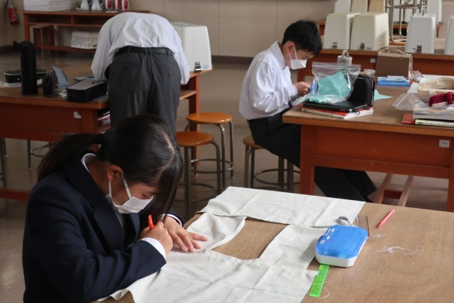 「エコバッグ」の製作に取り組んでいました。作業の手順を仲間としっかり確認しながら活動を進めています。ミシンの操作も手際よく進めています。