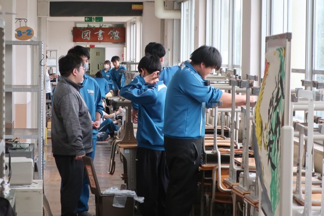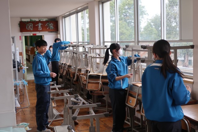 一方、ひと足先に進学先を決めた生徒たちは登校して、奉仕活動に取り組みました。各自の教室から机といすを運び出し、床を磨き上げ、仕上げにワックスがけを行いました。限られた人数でもしっかりと活動することができました。