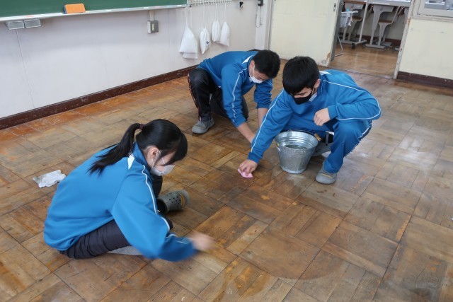 一方、ひと足先に進学先を決めた生徒たちは登校して、奉仕活動に取り組みました。各自の教室から机といすを運び出し、床を磨き上げ、仕上げにワックスがけを行いました。限られた人数でもしっかりと活動することができました。