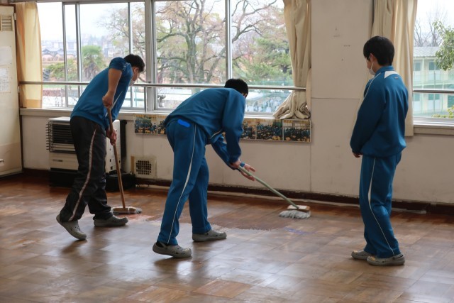 一方、ひと足先に進学先を決めた生徒たちは登校して、奉仕活動に取り組みました。各自の教室から机といすを運び出し、床を磨き上げ、仕上げにワックスがけを行いました。限られた人数でもしっかりと活動することができました。