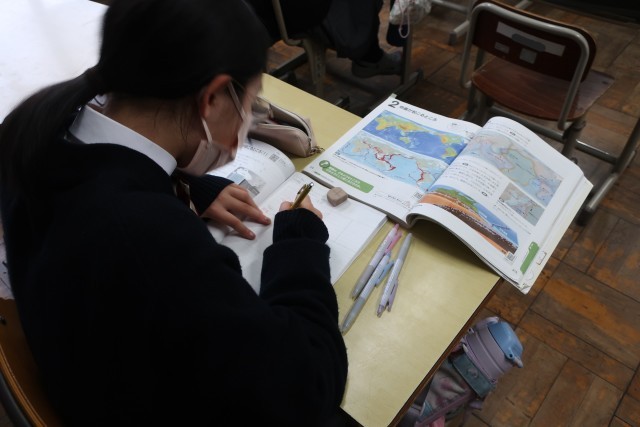 地震の単元で、その原理や伝わり方など科学的に学び、揺れの特徴やその伝わり方を計算で導き出していました。