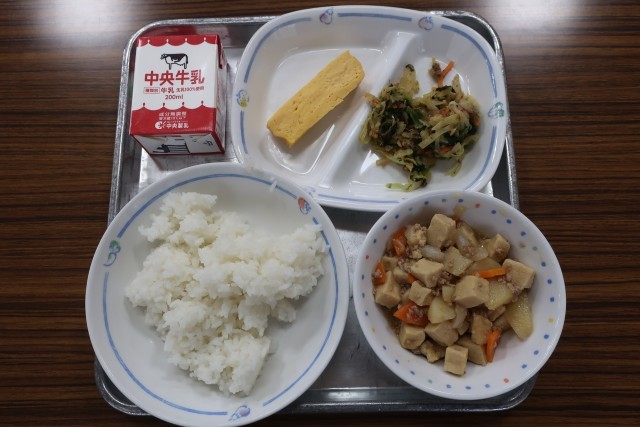 高野豆腐のうま煮、おかかあえ、厚焼き卵、ごはん、牛乳 でした。