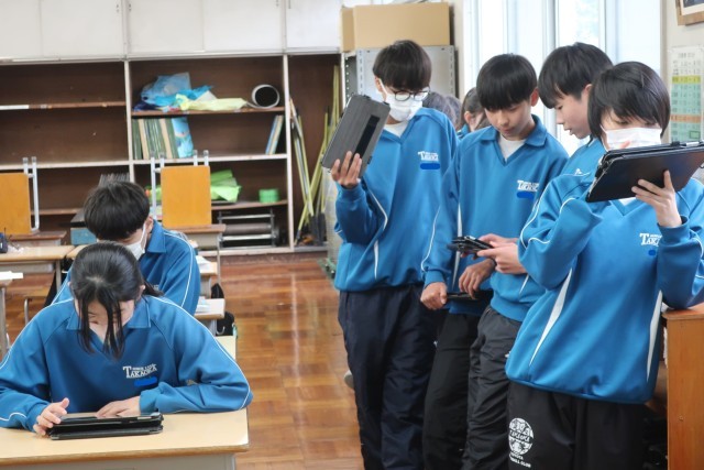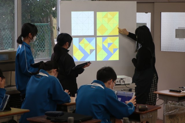 平面色彩構成の分野での作品づくりのため、タブレットを使ってデザインのアイデアを考えていました。集中して取り組んでいる様子が伝わってきました。