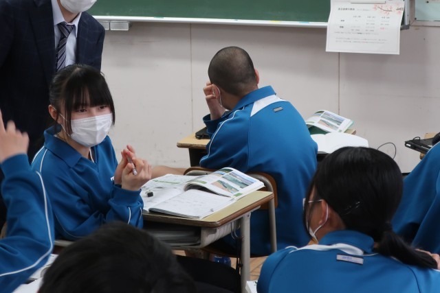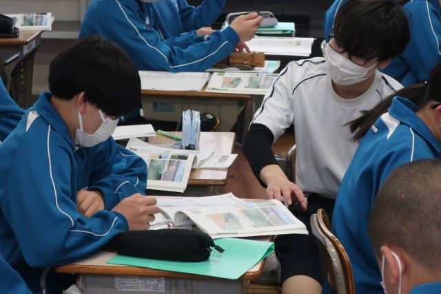 「地層の成り立ちをまとめよう」をテーマに、学習した重要語句を自分の言葉に直して説明できるよう、仲間と協力して学習していました。