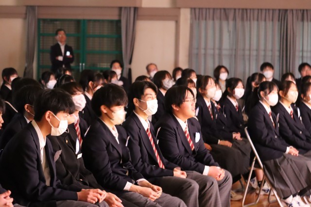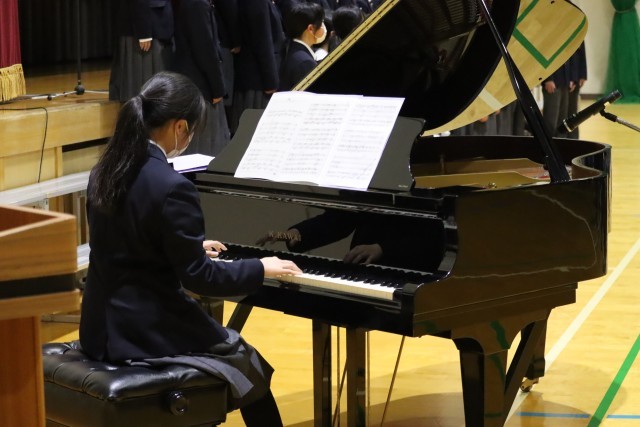 1,2年生でお世話になった現在他校で勤務の先生方からのメッセージ動画を見たあと、合唱の披露です。