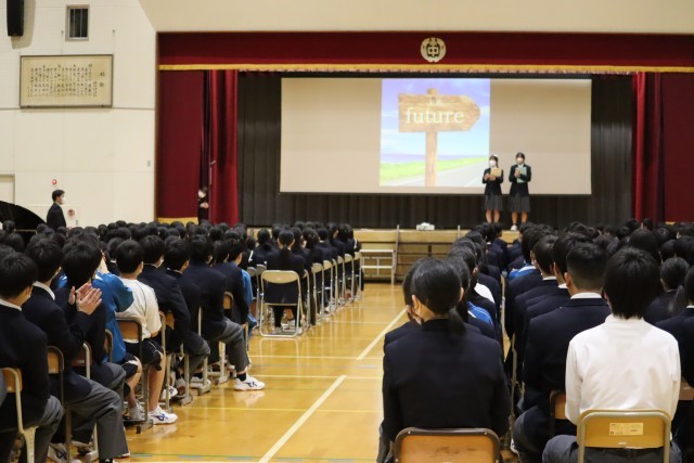 3年生の代表が、1,2年生にお礼を伝えています。このあと未来に向けて出発です。