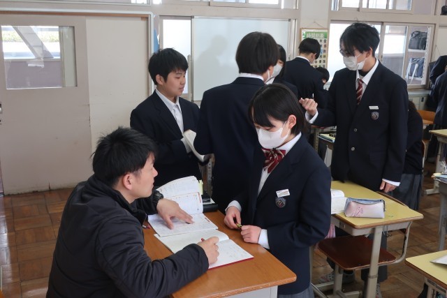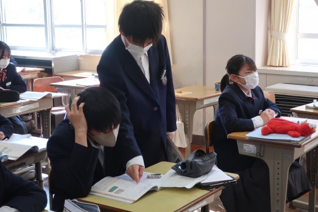 今年度の学習のまとめとして、教科書の章末問題に取り組んでいました。さまざまな単元の問題に挑戦し、理解が不十分なところを洗い出していきます。仲間の力を借りたり、教科担任に教えてもらうなどして、全員が4月からの2年生の姿を意識しているようでした。