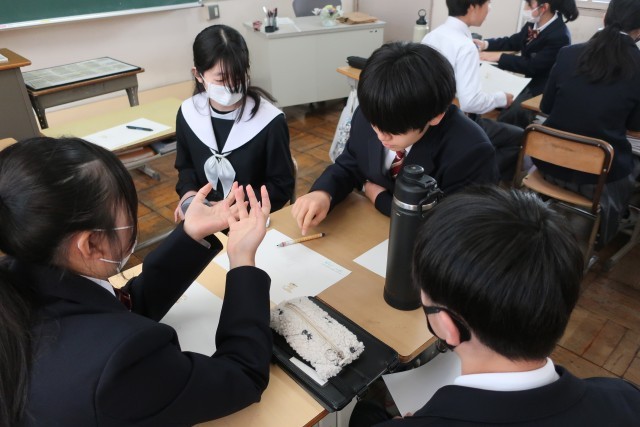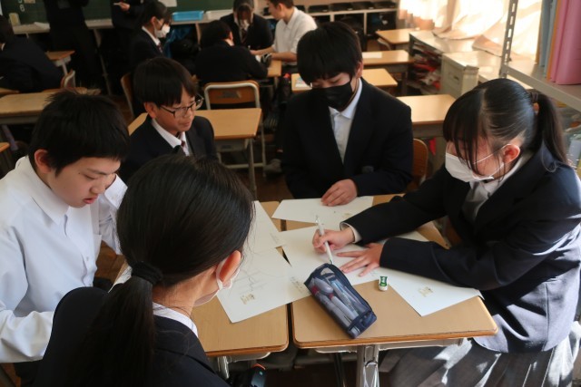 「身のまわりの町の様子に目を向けよう」をテーマに、まずはグループで相談しながら「高岡中から若林西小までの地図」を作成していました。