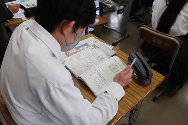 今回学習した「地層」の分野について、過去の他県の入試で出題された問題に挑戦していました。学習内容の確認と現在の学習の重要さを感じ取っているようでした。