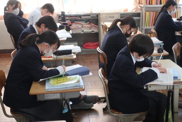 今年度の学習のまとめとして、教科書の章末問題に取り組んでいました。さまざまな単元の問題に挑戦し、理解が不十分なところを洗い出していきます。仲間の力を借りたり、教科担任に教えてもらうなどして、全員が4月からの2年生の姿を意識しているようでした。