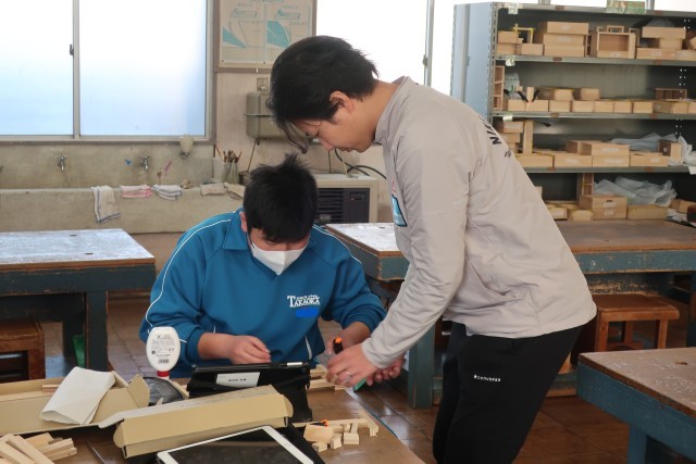 収納グッズの製作に取り組んでいます。個人で使用するもの、クラスで使用するものなど用途はさまざまですが、イメージどおりの作品に仕上がるよう、一生懸命取り組んでいました。