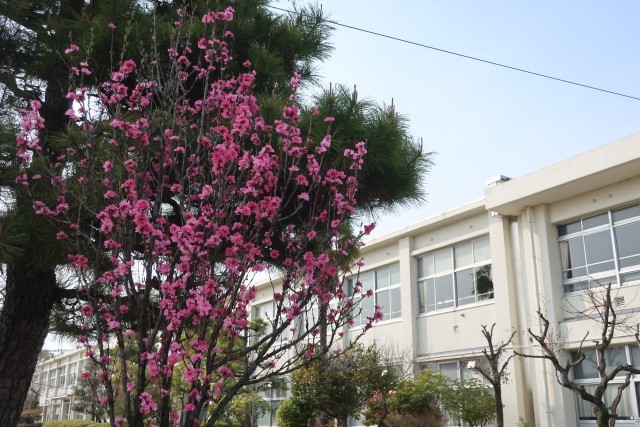 東門を入って一番最初に目にするこの景色。正面には、鮮やかなピンク色の花を咲かせた桃の木があります。大きな木ではありませんが、例年実がなり、特別支援学級の生徒が収穫してジュースなどをつくるときもあります。