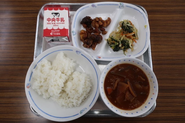 今日の給食では、ごはんのお米、レバーと大豆の甘辛煮の大豆、キムチ入りみそ汁のキムチが豊田市産の食材です。