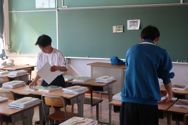 入学式・始業式の会場となる体育館のセッティング、1年生教室の飾りつけ、各クラスへの教科書の配布など、それぞれの分担でしっかりと活動していました。