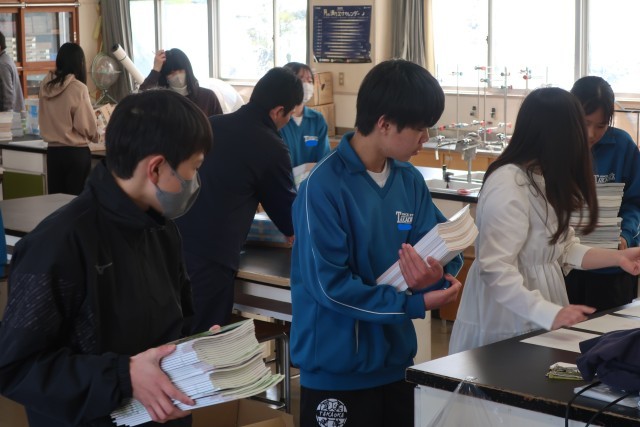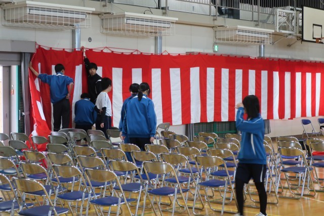 入学式・始業式の会場となる体育館のセッティング、1年生教室の飾りつけ、各クラスへの教科書の配布など、それぞれの分担でしっかりと活動していました。