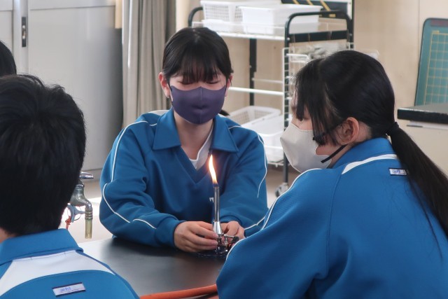 昨年度の学習の復習もかねて、ガスバーナーの使い方をグループで確認していました。マッチをする様子も堂々としていた感じがしました。