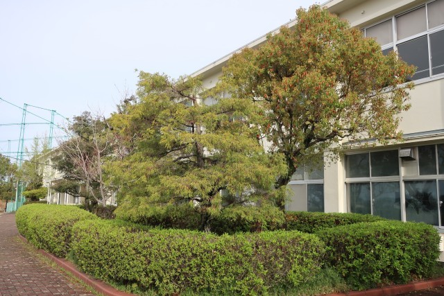 うつむくように咲く小さな白い花と、明るいグリーンの葉が魅力のドウダンツツジ。職員室の南側に植わっています。