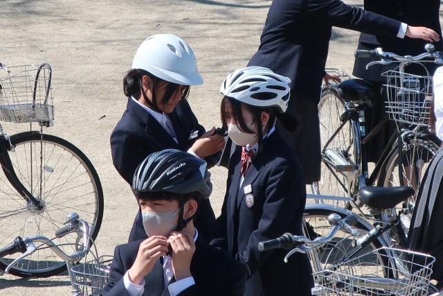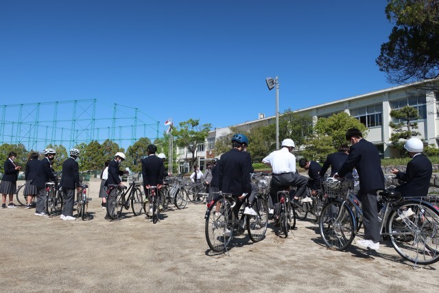 自転車点検が行われていました。安全な登下校に向けた第一歩の取組です。