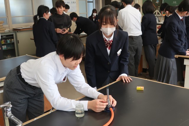 昨年度学習したガスバーナーの使い方について、手順を確認しながら全員が確実に操作できるように練習していました。
