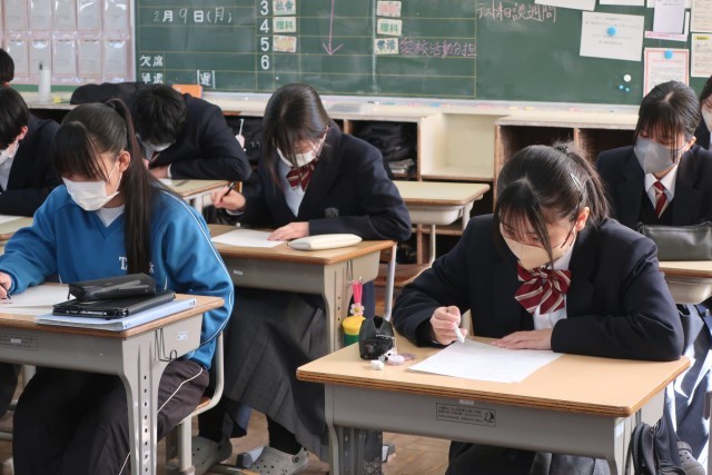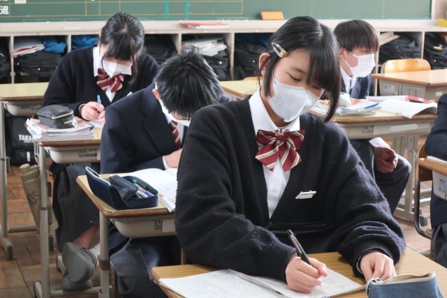 3年3組の国語の授業の様子です。確認テストに向けた予想問題を解きながら、正解を導...