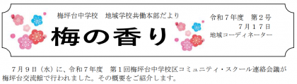7月9日(水)に、令和7年度 第1回梅坪台中学校区コミュニティ・スクール連絡会議が梅坪台交流館で行われました。その概要をご紹介します。 梅の香り 第2号