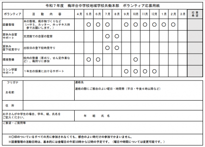 保護者の皆様 地域の皆様 4月に配布しました地域学校共働本部だより「梅の香り」にて募集いたしました「地域ボランティア」ですが、ご登録いただいたボランティアの方は7月19日現在、のべ7名となっております...