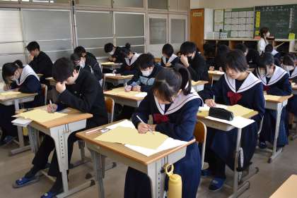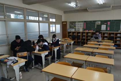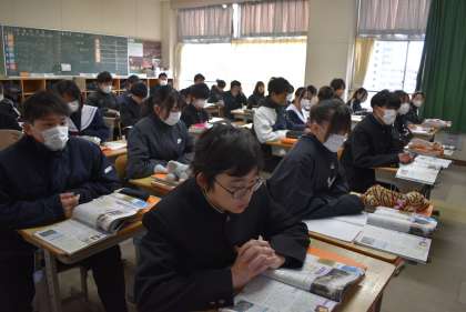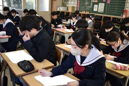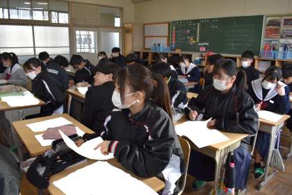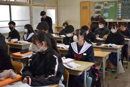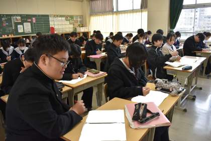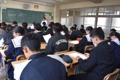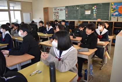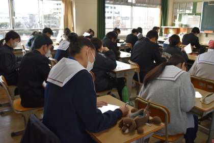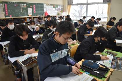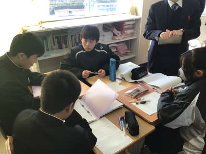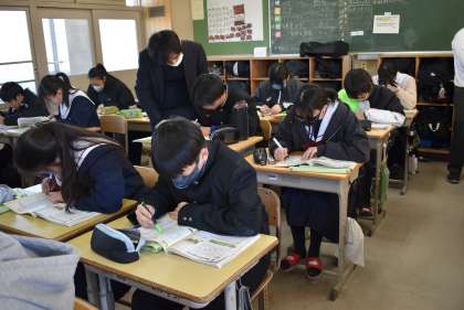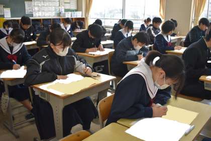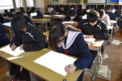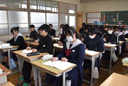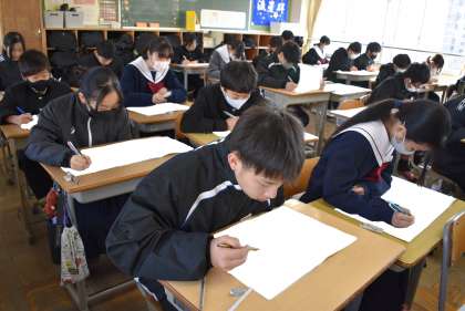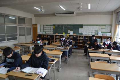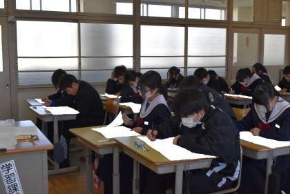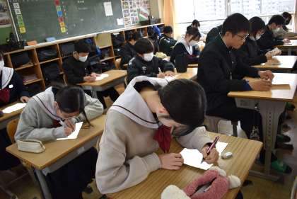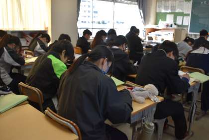 今日から3日間、私立高校の一般入試が行われ、多くの3年生が受験します。中でも、初日の今日は、近隣の私立高校で入試が行われるため、学年全体で60人ぐらいが受験に出かけています。各教室の様子をのぞいてみると、登校している生徒の方が少なく、寂しい感じがしましたが、生徒たちは自習をしたり、制作物に取り組んだりしていました。がんばれ受験生!