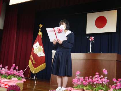 2,3年生は、新型コロナウイルス感染症拡大防止のため、式には参加しませんでしたが、生徒会長が在校生を代表して、「歓迎の言葉」を1年生に伝えました。