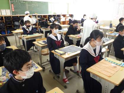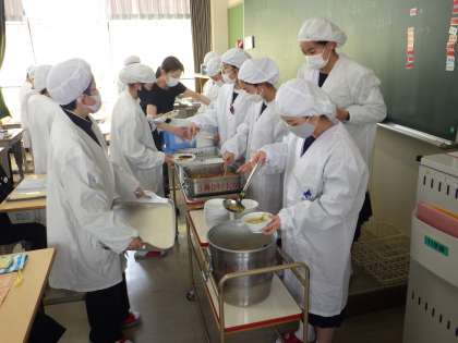 4/13(水) 給食の様子です(1年生) 1 公開日 2022/04/13 更新日 2022/04/13 お知らせ 今週から、給食が始まりました。 1年生も給食の準備の手順がわかり、迅速に取り組んでいます。 本年度も新型コロナウイルス感染症対策として、全員、前を向いて黙食です。 一日も早く、新型コロナウイルス感染症が収束し、楽しい会食になることを祈っています。 11学級の給食の様子です。